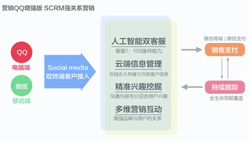 來看一下,營銷QQ增強(qiáng)版橫跨QQ和微信雙平臺(tái),在PC端通道,企業(yè)可在官方網(wǎng)站、MINISITE等多個(gè)渠道嵌入營銷QQ,通過趣味創(chuàng)意營銷手段鼓勵(lì)用戶主動(dòng)與品牌進(jìn)行交互;而在移動(dòng)端通道,可以通過移動(dòng)終端掃描二維碼的形式,將用戶轉(zhuǎn)化為微信公眾號(hào)粉絲,從而進(jìn)行進(jìn)一步互動(dòng)和營銷。如此,通過QQ和微信的互補(bǔ)整合,覆蓋PC和移動(dòng)雙終端,將不穩(wěn)定的弱關(guān)系轉(zhuǎn)化為企業(yè)可控的強(qiáng)關(guān)系商機(jī),更好地運(yùn)用SCRM營銷。