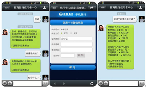招行信用卡用戶可以通過加好友的形式,與招行信用卡中心智能微信客服進(jìn)行互動,通過銀行卡或身份證號與招行網(wǎng)銀系統(tǒng)進(jìn)行綁定對接,開展還款,轉(zhuǎn)賬、積分兌換等復(fù)雜業(yè)務(wù)。該平臺可以24小時不間斷的為招行用戶在線服務(wù),交流界面友好、通俗易懂。