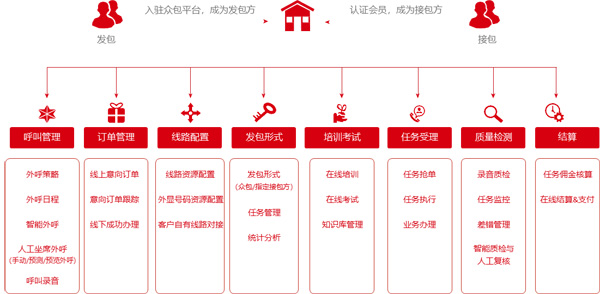 眾包是中國東信打造的互聯(lián)網(wǎng)化的呼叫中心平臺(tái),平臺(tái)采用互聯(lián)網(wǎng)眾包模式,上游有呼叫業(yè)務(wù)需求的企業(yè)客戶可以在眾包平臺(tái)上發(fā)布任務(wù),同時(shí),平臺(tái)接入了分布在全國的大量的下游呼叫中心服務(wù)商,服務(wù)商負(fù)責(zé)組織海量的呼叫坐席在平臺(tái)上進(jìn)行搶單作業(yè)。通過眾包模式,平臺(tái)實(shí)現(xiàn)了呼叫中心行業(yè)的集約化管理,并能夠有效的調(diào)用全國的外呼生產(chǎn)力,極大的提升了整個(gè)行業(yè)的服務(wù)效率。同時(shí),平臺(tái)的一站式統(tǒng)一管理,為上下游企業(yè)客戶提供了各種自動(dòng)化的管理工具和智能化的服務(wù)工具,減輕了企業(yè)客戶的業(yè)務(wù)管理負(fù)擔(dān),能夠?yàn)閺V大企業(yè)用戶實(shí)現(xiàn)了提效降本的目標(biāo)。