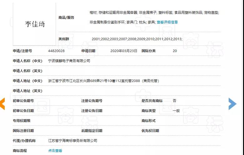 近日,“口紅一哥”李佳琦持股49%的寧波鎂麒電子商務有限公司注冊的第44820028號“李佳琦”商標駁回復審有了最新進展!因提供的在案證據(jù)不足以證明申請商標在指定使用商品上經(jīng)過使用已具有一定知名度,商標局決定申請商標在復審商品上的注冊申請予以駁回。