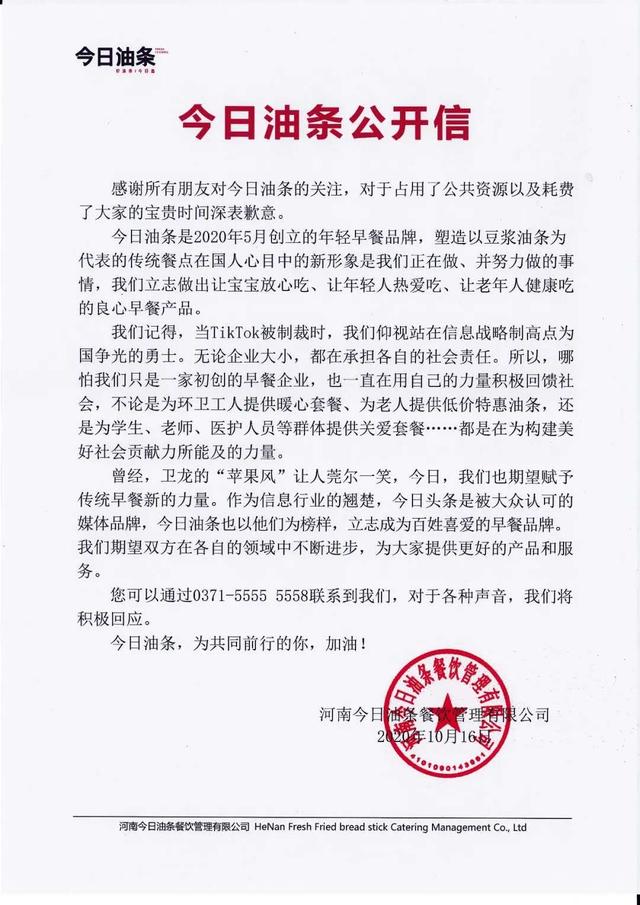 位于河南的今日油條餐飲管理有限公司成立于今年5月13日,注冊資本100萬元。除掛出“今日油條”的招牌外,該公司還申請了今日面條、餅多多、快手抓餅、明日油條等商標,不過尚未注冊成功。