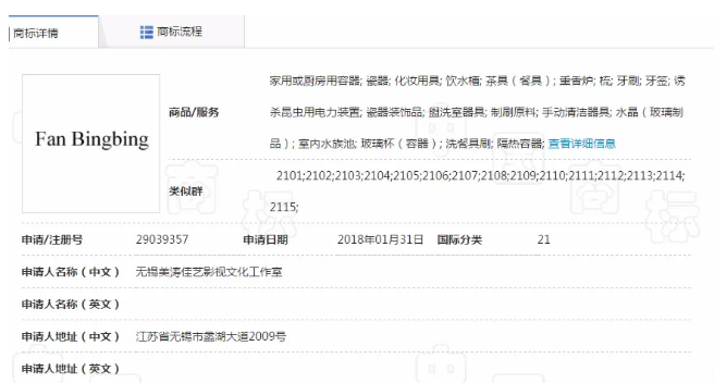 據(jù)悉,范冰冰曾想使用自己的名字拼音大小寫“FAN BING BING”“fan bing bing”注冊(cè)申請(qǐng)商標(biāo),其中,注冊(cè)在21類上的第29039357號(hào)“Fan Bingbing”商標(biāo)被國(guó)家知識(shí)產(chǎn)權(quán)局以該商標(biāo)構(gòu)成《商標(biāo)法》第31條所指情形為由,將其指定使用在其余復(fù)審商品上的注冊(cè)申請(qǐng)予以駁回。范冰冰不服此決定,這才起訴了國(guó)家知識(shí)產(chǎn)權(quán)局。
