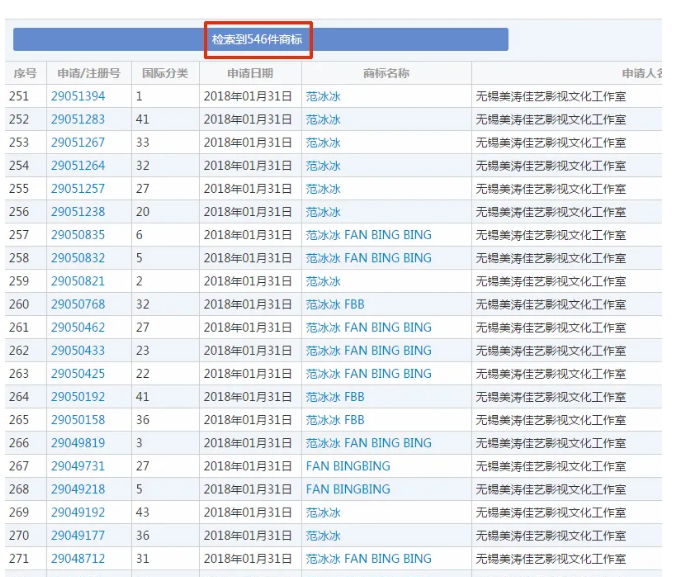 據(jù)查詢,至今為止,無錫美濤佳藝影視文化工作室一共申請(qǐng)了500多個(gè)商標(biāo),多為范冰冰本人及其弟弟范丞丞的名字所有相似的名稱,涵蓋多個(gè)類別。